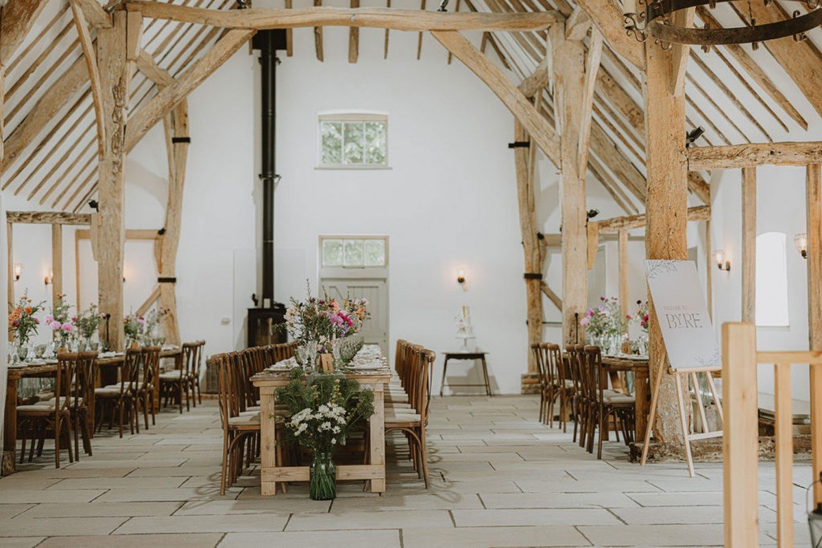 A beautifully converted 18th-century oak-framed barn in the heart of the Kent countryside, blending historic character with modern comfort for a perfectly rustic wedding.